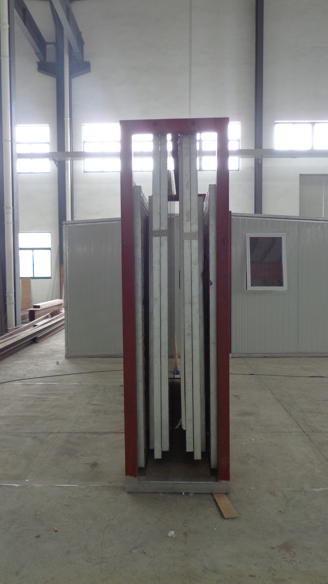 Panel dinding terbuat dari 50mm dengan panel sandwich busa EPS dengan kepadatan 10kg. Semua panel diperbaiki di pabrik dan dibentangkan dengan panel atap. Ketebalan baja untuk panel adalah 0,35mm di luar dan 0.35mm di dalam.