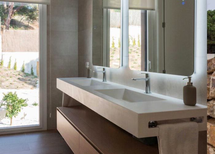 Aliran air di dalam ruangan membentang ke luar ke teras yang luas, tempat yang ideal untuk bersantai dan makan di luar ruangan.