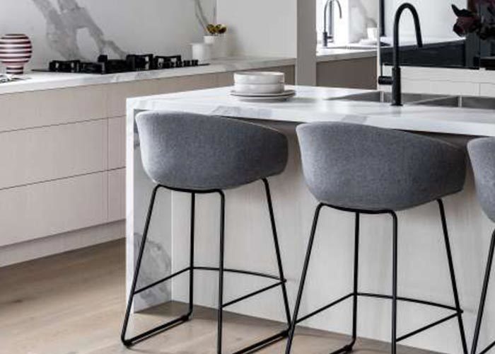 Beyond the staircase, the ground floor opens into its functional and emotional center: an open-plan kitchen and dining area designed for contemporary family life. The kitchen occupies a position that allows cooks to remain connected with activity in both the dining area and the rear living space beyond.